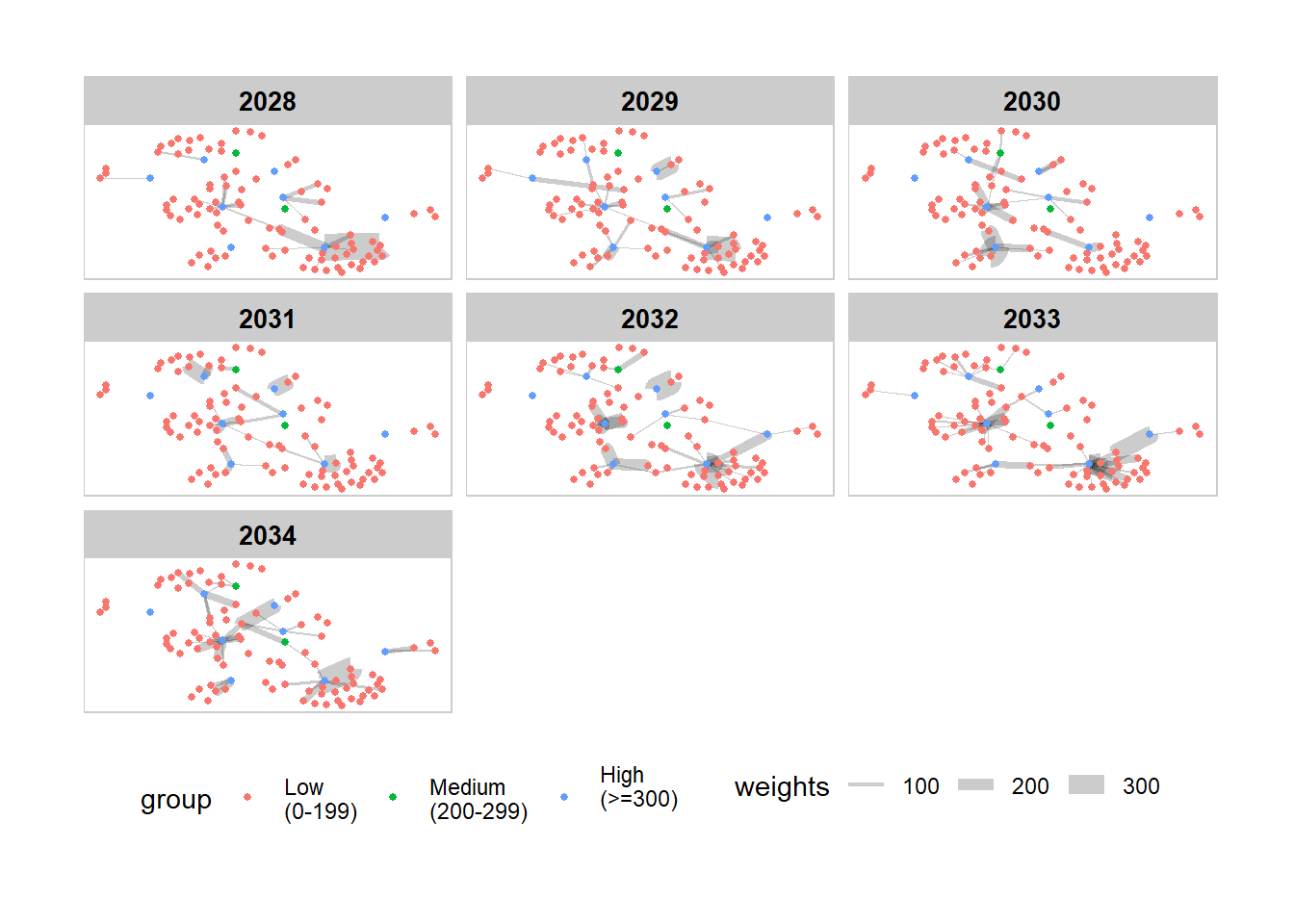 visLayout(randomSeed = 123)The In_degree network graphs from 2028 to 2034 are plotted for comparison in a facet. This will provide us with an overview on how the trend of In_degree centrality metric changes over time. We will also closely examine the difference between the first and last year for more insights.