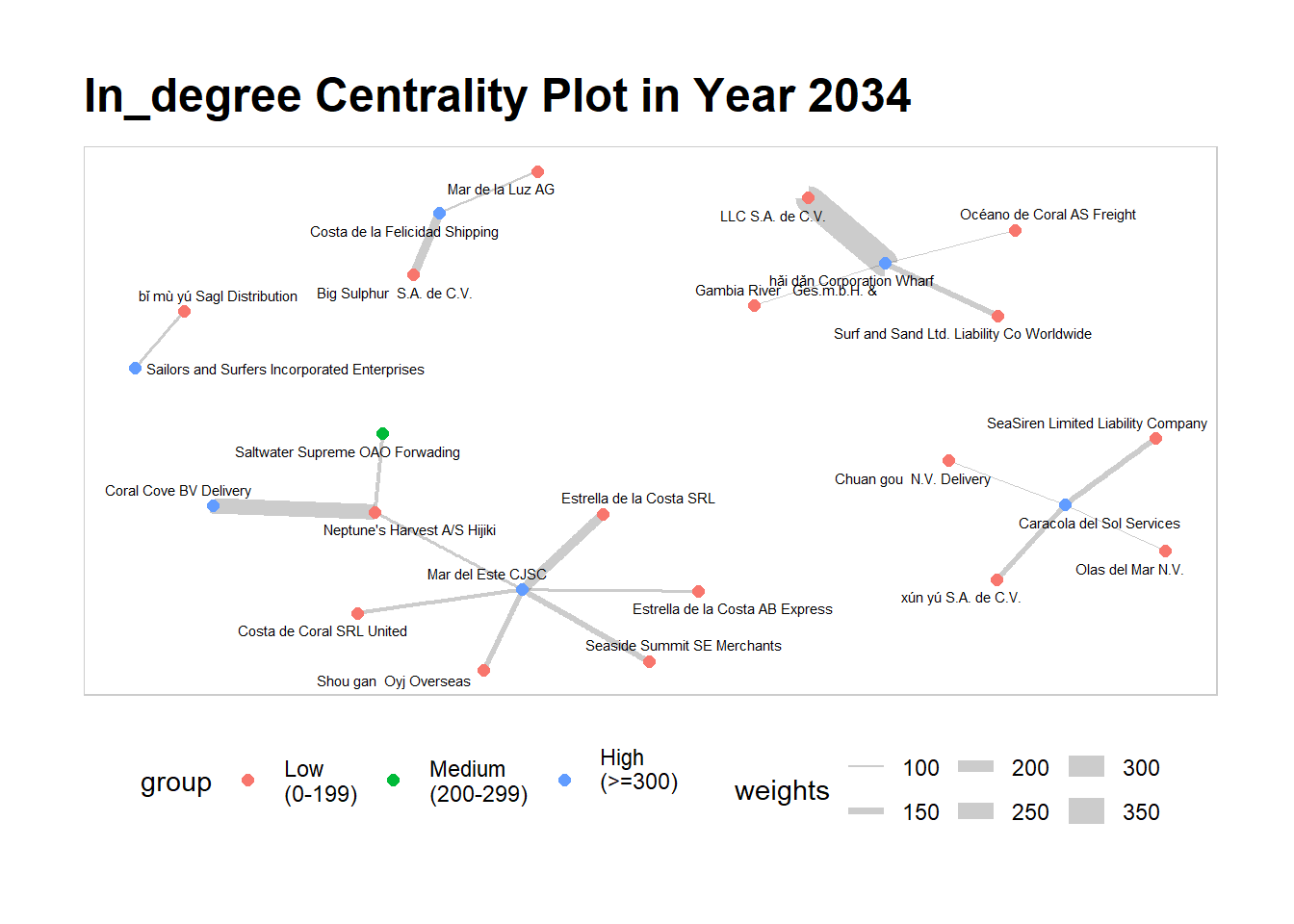 Moving forward to 2034, we can observe that the landscape has totally changed from 2028. LLC SA de CV, who used to supply to hai dan Corporation Wharf, is now their biggest supplier in 2034. Similarly, Mar Del Este CJS’s biggest supplier is now Estrella de la Costa who had also supplied them six years ago, abeit at a reduced weight (edges). Interestingly, we do not see Pao gan SE Seal, one of the nodes that is high in in_degree centrality score. By such comparisons between each year, we can chart the movement of the entities in FishEye’s knowledge graph and obtain deeper insights on their characteristics and behaviours.